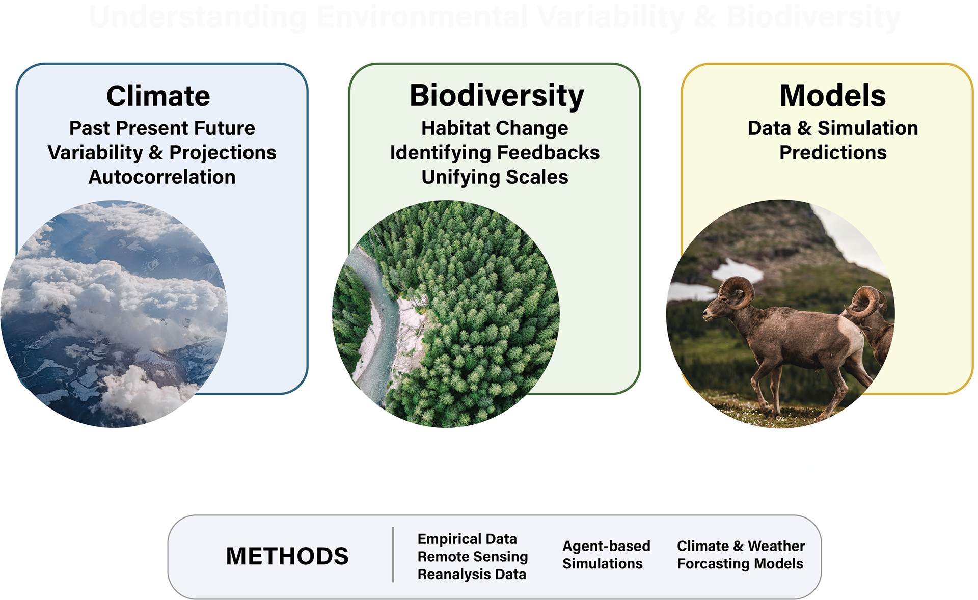 My research aims to address these questions by employing simulation-based experiments to investigate how environmental variability, along with other potential drivers, affects biodiversity across both space and time. To achieve this, my work integrates agent-based simulations and experiments that incorporate global climate models of Earth's past and future, remote sensing and reanalysis data, empirical biodiversity datasets, and mathematical modelling tools to identify causal mechanisms that structure biodiversity.